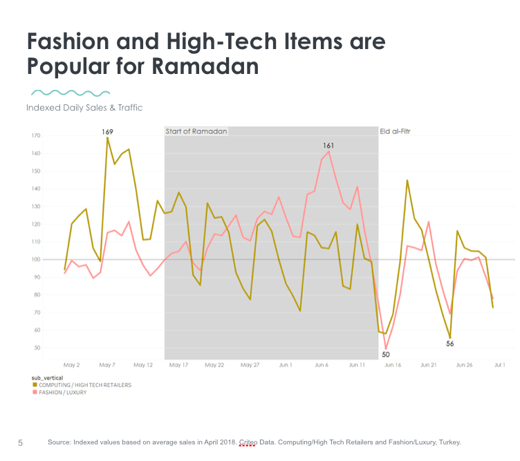 Rapora göre 2018'de, Ramazan ayının en popüler perakende kategorisi ise moda ve lüks teknoloji olarak öne çıkıyor. Satışlar, Ramazan Bayramı'ndan önceki hafta yüzde 61 oranın artış gösterirken, teknoloji ürünlerinin satışları ise Ramazan ayından önceki ve sonraki hafta yüzde 69 oranında artıyor.