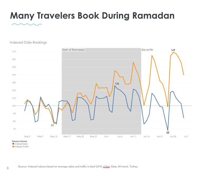 Rapora göre 2018'de, Ramazan ayı boyunca rezervasyonlar mobil üzerinden artarak devam etti. Kurban Bayramı'nda ise bu rezervasyonlar yüzde 57'ye yükseldi. Mobile benzer bir şekilde web sitelerinde de sürekli bir yükseliş görüldüğünü ekleyelim. Ramazan Bayramı'ndan sonraki haftalarda site trafiği yüzde 69'a kadar artarken, rezervasyon işlemlerinde de yüzde 26’lık bir artış izlendi.