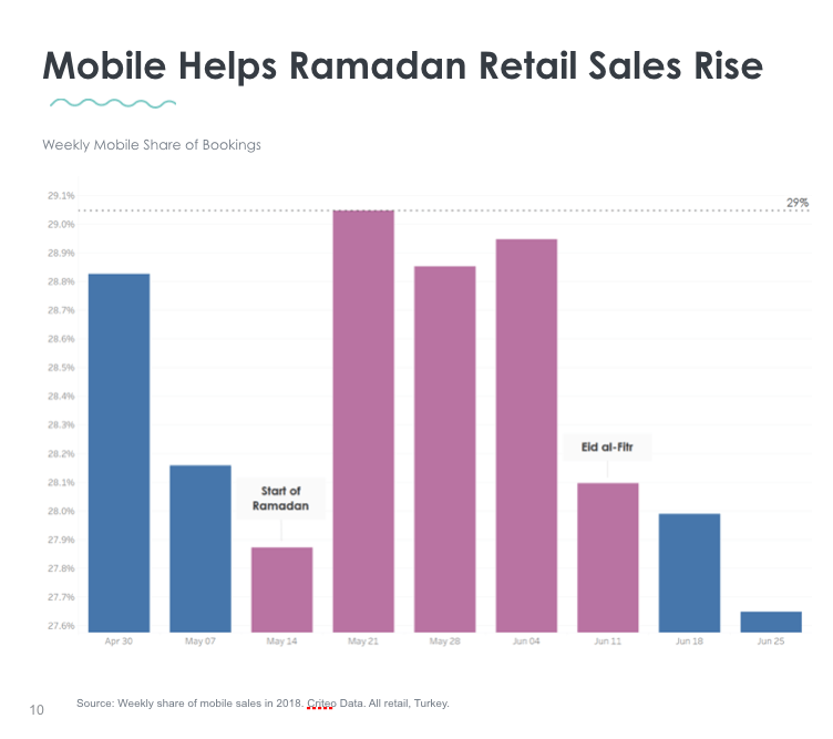 Ramazan’da perakende satışlarının yükselmesinde mobil kullanım da önemli bir rol oynuyor. Mobil kullanımın etkisiyle satışlar, Ramazan ayının yanı sıra Ramazan Bayramı’nda da artış göstererek yüzde 29’a yükseldi. Özetlemek gerekirse; tüketiciler Ramazan ayına yaklaşırken ürünleri incelemeye ve satın almaya başlıyorlar. Bu eğilim birkaç hafta boyunca yükselerek devam ediyor ve en yüksek artış Ramazan Bayramı’ndan 1-2 hafta önce gerçekleşiyor.