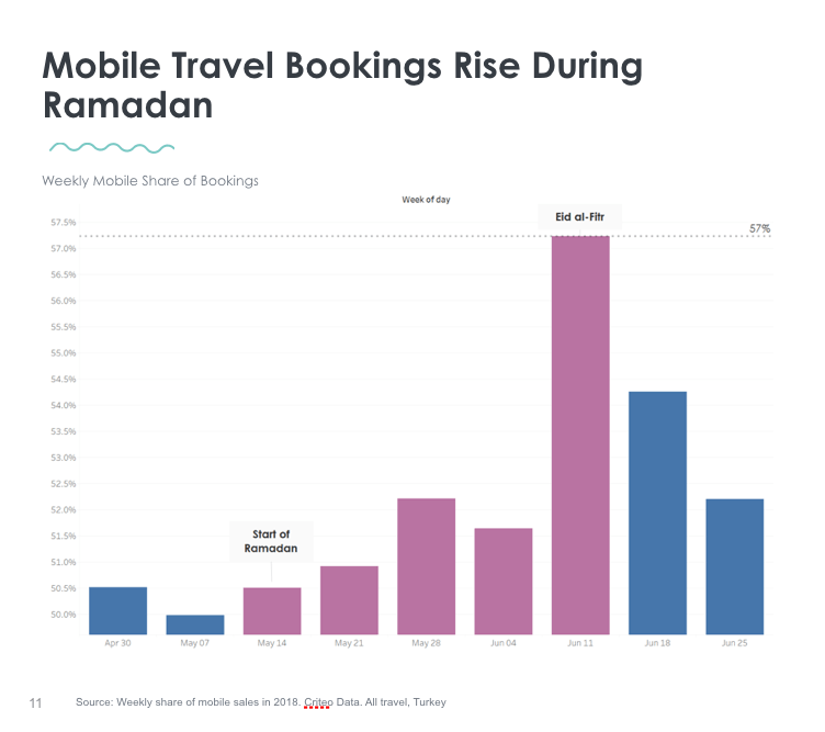 Raporda yer alan verilere göre tüketiciler, seyahat rezervasyonlarını Ramazan ayında yapmaya başlıyor ve takip eden haftalarda bu işlemlerin artarak devam ettiği görülüyor.Hatta web sitesi üzerinden yapılan seyahat rezervasyonları tüm rezervasyonların yüzde 79'undan fazlasını oluşturuyor. Buna rağmen tüketicilerin seyahat rezervasyonlarında akıllı telefonlarını da kullanmayı tercih ettiklerini belirtelim.