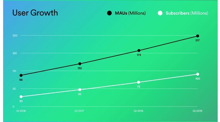 Spotify dün açıkladığı ilk çeyrek raporunda ücretli abone sayısının 100 milyona ulaştığını duyurdu. Ücretli abone sayısı yıldan yıla yüzde 32 büyüme gösteren Sportify, ücretsiz aboneler de dahi olmak üzere dünya çapında 217 milyon aylık aktif kullanıcıya sahip. Bu rakamlara şirketin ürünü Şubat ayında Hindistan'a açıktan sonra eklenen Hintli kullanıcıların da dahil olduğunu belirtelim.