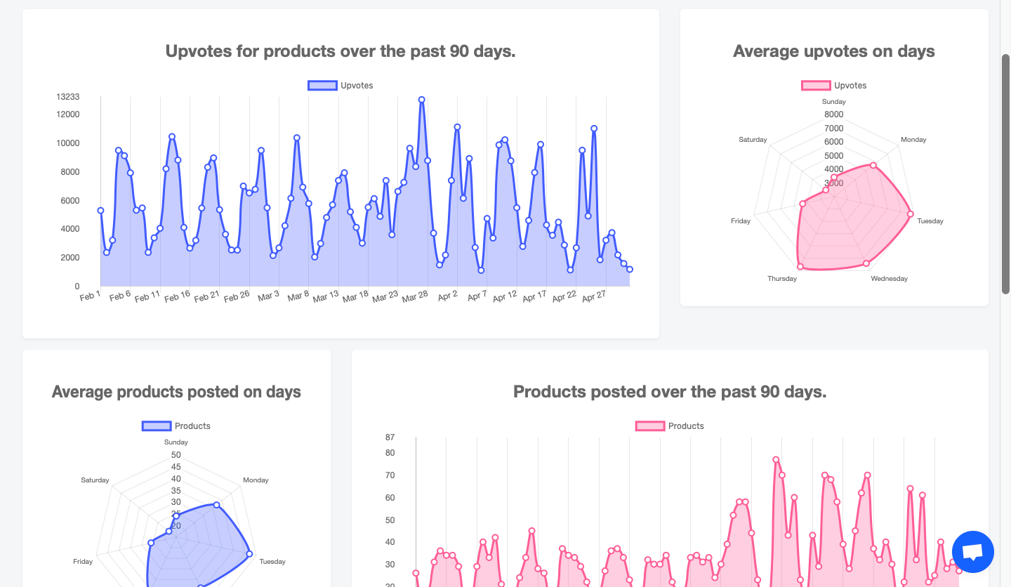 Aynı şekilde Product Hunt'ta son 90 gün içinde kaç ürünün piyasaya sürüldüğünü ve gün başına ne kadar destek oyu kullanıldığını görmeniz de mümkün.