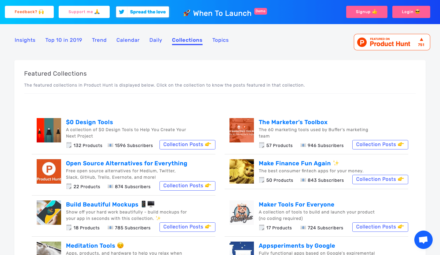 Bu aracın aynı zamanda Product Hunt'taki öne çıkan konuları kolayca takip etmenizi kolaylaştırdığını da belirtelim. Aynı şekilde koleksiyonları da kolayca analiz etmenizi sağlayan When to Launch, her bir ürünün erişimini sunarak rakip analizi yapmanızı da kolaylaştırıyor.