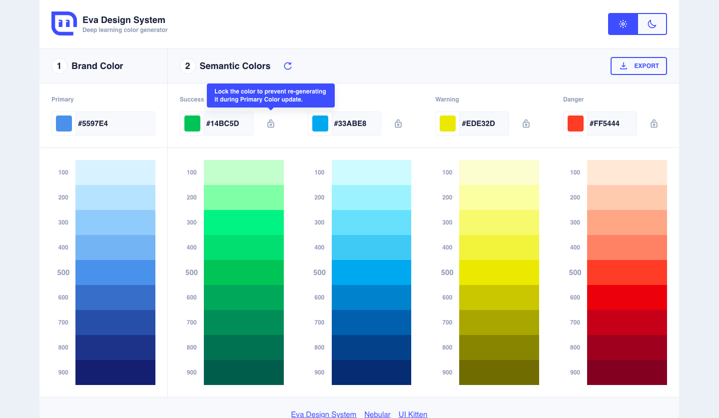 Eğer marka renginiz değişirken Eva Colors'ın semantik renkleri değiştirmesini istemiyorsanız, renklerin yanındaki küçük kilit tuşuna basmanız gerekiyor. Böylece sitenizde gerçekleşecek başarılı işlemlerde, uyarılarda veya tehlike arz durumlarda kullanacağınız renkleri farklı öneriler arasından seçebilirsiniz.