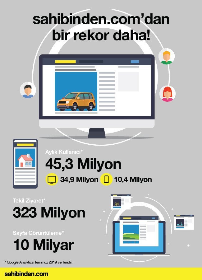 2019 Temmuz Google Analytics verilerine göre web’de 34,9 milyon, mobil’de 10,4 milyon olmak üzere toplamda 45,3 milyon aylık aktif kullanıcıya; aynı zamanda 323 milyon ziyaret ve 10 milyar sayfa görüntülemeye ulaştı. Toplam 10 kategoride yaklaşık 6 milyon aktif ilanın yer aldığı Sahibinden.com, similarweb verilerine göre Google, Facebook, Twitter, Instagram ve Youtube 'dan sonra Türkiye’nin en çok ziyaret edilen internet platformu oldu.