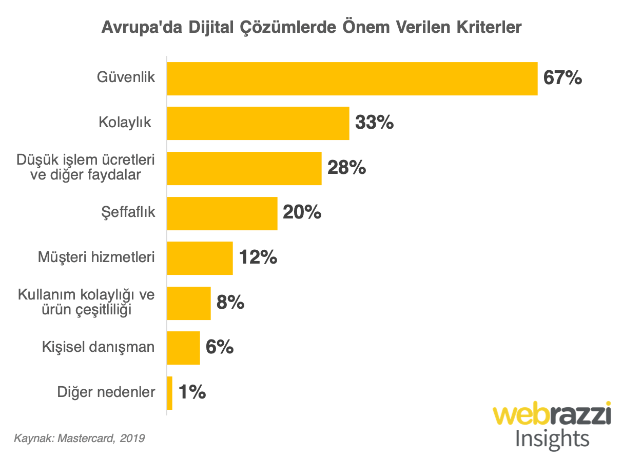 Mastercard'ın araştırmasına göre, tüketicilerin yaklaşık üçte ikisi, yani %63'ü geleneksel bankalardan mobil bankacılık uygulamalarını kullandığını, %20'si ise yalnızca dijital bankalardan mobil bankacılık uygulamalarını kullandığını söylüyor. Katılımcıların %13'ü önümüzdeki 12 ay içinde kullandıkları bankayı dijital banka ile değiştirebileceğini söylerken, değiştirmeyeceğini söyleyenlerin oranı ise %41 oldu. Şu an için geleneksel bankalar mobilde lider konumda olsa da gelecekte bu durum değişkenlik gösterebilir. Geleneksel bankaların liderliğini devam ettirebilmesi için tüketiciler için önemli olan dijital bankacılık özelliklerine öncelik vermesi gerekiyor.