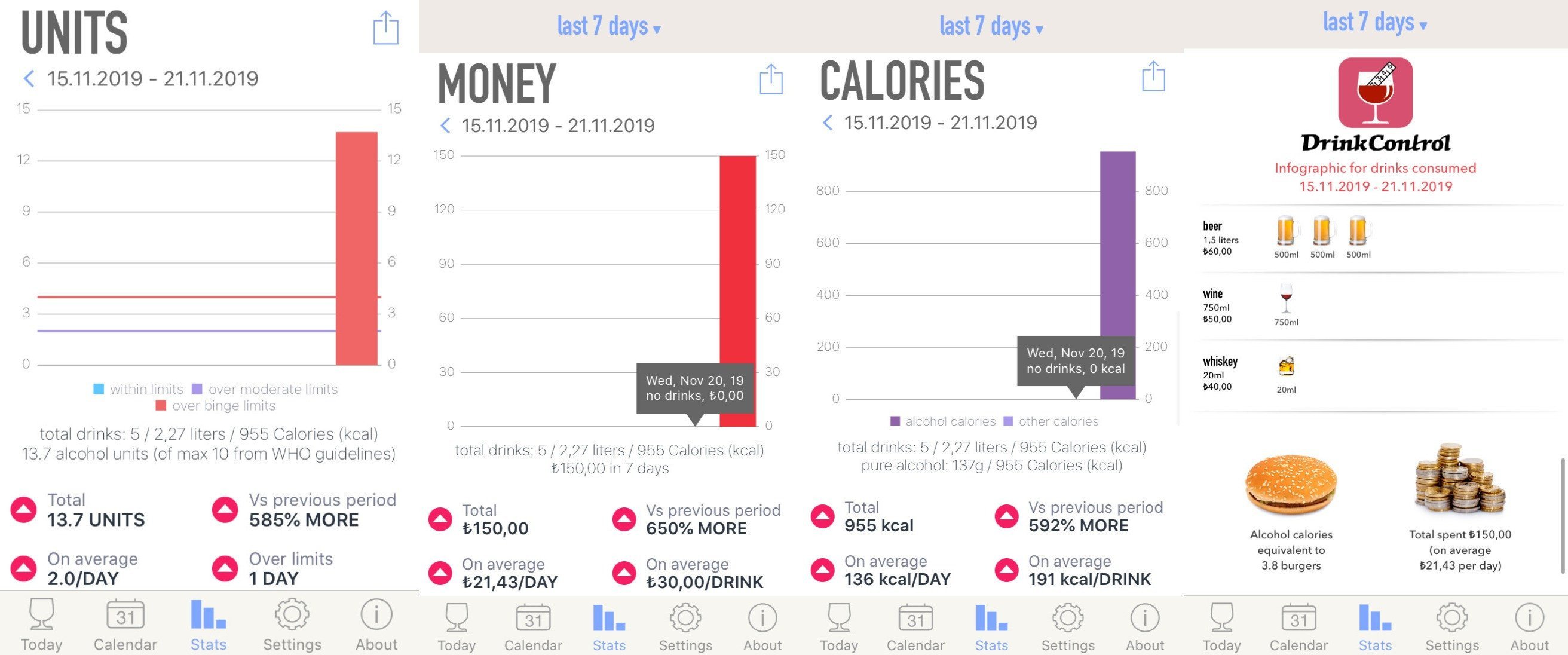 App Store'dan cihazınıza indirdiğiniz DrinkControl, kullanım için herhangi bir üyelik istemiyor, fakat ayarlar kısmından cinsiyetinizi platforma belirtmeniz kalori ölçümü açısından önem taşıyor. Hatta dilerseniz Apple'ın Sağlık uygulamasını da platforma entegre edebiliyor ve ikisinin iş birliği içinde çalışmasına yardımcı olabiliyorsunuz. Diyelim ki bir önceki akşam arkadaşlarınızla eğlenmeye gittiniz ve eğlence sırasında içtiğiniz içeceği, ne kadar içtiğinizi, her içecek başına ne kadar ödediğinizi platforma ekliyorsunuz ve bunu bir alışkanlık haline getiriyorsunuz. DrinkControl eklediğiniz bilgileri size daha sonra grafik olarak sunuyor ve ortalama ne kadar içtiğinizi, içtiklerinizin neye tekabül ettiğini size gösteriyor. Harcalamarınız da ona göre şekilleniyor.