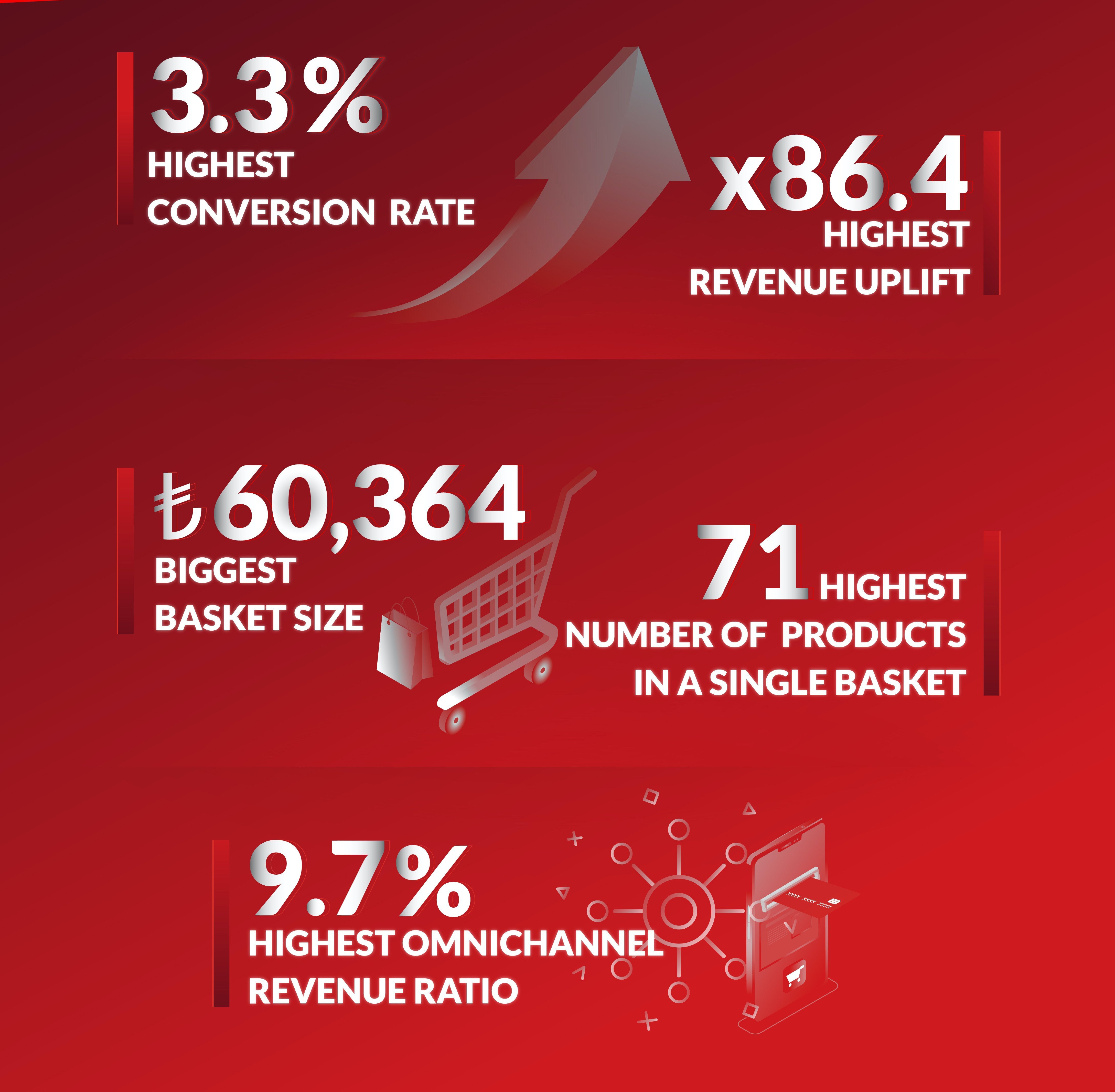 Efsane Cuma ve Cyber Monday alışveriş döneminde bir müşterinin tek sepette 60.364 TL’lik ürün satın alması dikkat çekerken, başka bir markanın müşterisinin alışveriş sepetine tam 71 ürün eklemesi dikkat çekici bir diğer unsur olarak öne çıktı. Bu dönemde en yüksek dönüşüm oranı ise yüzde 3,3 olarak gerçekleşti.