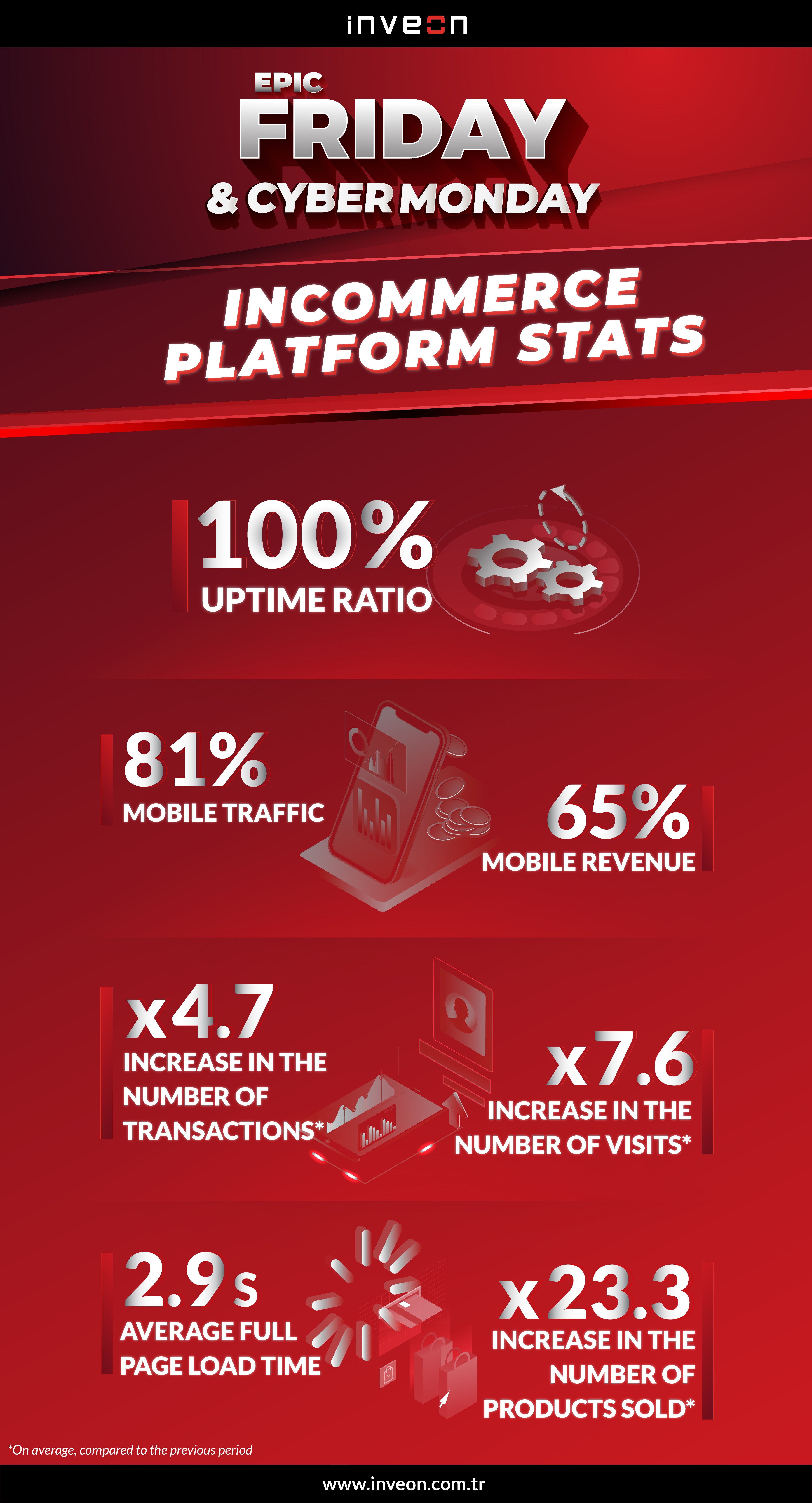 Kampanya süresince trafiğin yüzde 81’i mobilden gelirken, toplam cironun yüzde 65’i mobilden elde edildi. Türkiye’de ve uluslararası yapılan işlemler ise yaklaşık 5 kat arttı. Inveon’un hizmet verdiği markalarda bir sayfanın tamamen yüklenmesi ortalama 2,9 saniye sürerken, kampanya döneminde e-ticaret sitelerinde hiçbir sorun yaşanmadan alışveriş dönemi tamamlandı.