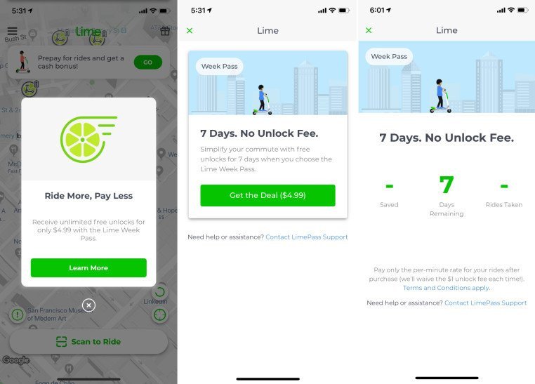 ABD şehirlerinin çoğunda haftada 4,99 dolar olarak ücretlendirilen LimePass ile Lime'ı kullanmak, haftada 5 kullanımdan sonra ücretsizmiş gibi düşünülebilir. Zira scooter'lar tek kullanım için 1 dolar olarak ücretlendiriliyor. LimePass'i etkinleştirmek için sol üst köşedeki menü simgesine dokunmak ve ardından talimatları izlemek yeterli oluyor. Şimdilik LimePass otomatik olarak yenilenmiyor, bu yüzden kullanıcının her hafta uygulama üzerinden manuel olarak ödeme yapması gerekiyor. Sürücülerin yine de dakikada yaklaşık 0,15 dolar tutan kullanım ücretini ödemeleri gerektiğine de dikkat çekelim. Yani LimePass'i haftada 5 defadan fazla kullananlar her şekilde karlı durumu geçiyor.