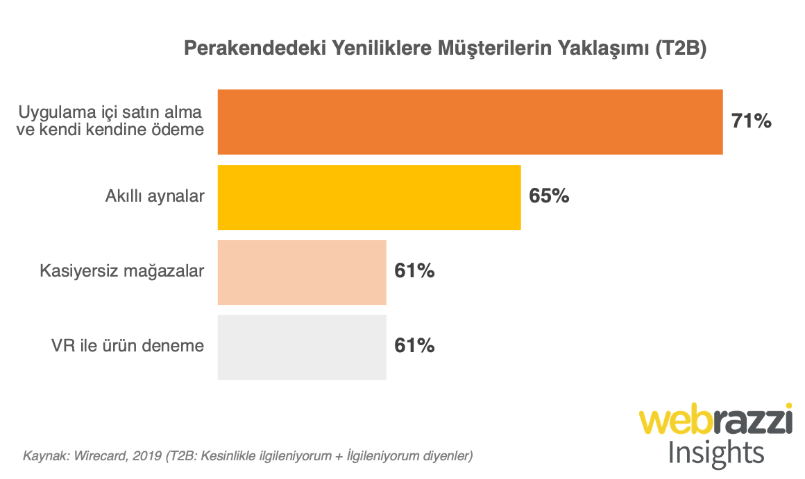 - Kasiyersiz mağazalar da görüşülen kişilerin %61'i tarafından ilgi görmekte. İlk örneğini Amazon Go ile gördüğümüz kasiyersiz mağazalar hız ve kolaylık sağlayarak müşterilerin önem verdiği alanlardan birine dokunmakta. Defacto'nun akıllı ayna yer alan mağazasında denemekte olduğu kasiyersiz deneyim yakın zamanda diğer perakendeciler tarafından da benimsenerek özellikle indirim dönemlerinde hız sağlayabilir.