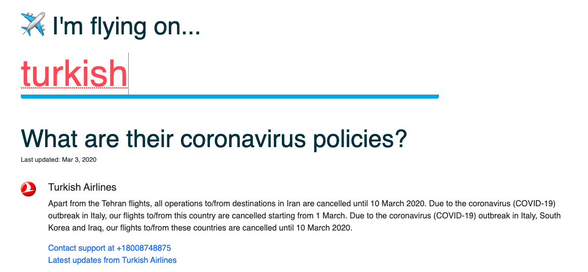 "Should you fly?" adlı uygulama hava yolu şirketlerinin korona virüs salgını ile ilgili politikalarını anlık olarak kullanıcıya sunuyor ve sürekli güncellendiği için güncel bir bilgi bankası niteliği taşıyor. Platformdaki bilgilerin ne zaman güncellendiği, arama butonunun altında yer alan kısımda görülebiliyor. Her şirketin web sitesine tek tek girip sadece salgın ile alakalı başlıkları bulmak ciddi anlamda zaman kaybettirirken, Should you fly? bunu kullanıcı için tek tuşa indirgiyor.