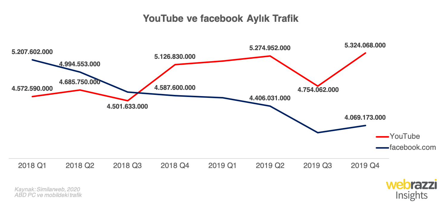 2019'da web trafiğinin %80'ini video oluşturdu. YouTube'un açıkladığı rakamlara göre mobil cihazlardan izlenen içerik de ikiye katlanmış durumda. Sosyal medya trafiği açısından bakıldığında da bir süredir facebook'un önde götürdüğü yarışta YouTube öne geçmiş durumda.