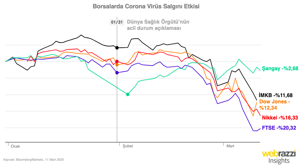 Birkaç sektörde beklenmedik hareketlenme yaratan corona virüs etkinlik ve seyahatlerin iptal ya da ertelenmesi ile ilgili kategorileri olumsuz etkiledi ve her gün duyurulan yeni bir iptal kararı ile ekonomiyi etkilemeye devam ediyor. Japonya'nın yaklaşık 25 milyar $ harcadığı olimpiyat oyunlarının da iptal edilmesi gündemde, NBA maçlarının ne kadar olduğu bilinmeyen bir süreyle oynanmayacağı duyuruldu, ülkeler turizme kısıtlamalar getirdi, insanların virüs nedeniyle eve kapanma isteği arttıkça sosyal yaşamda da etkisi görülmekte - İngiltere'de Music Venue Trust'ın yaptığı açıklamaya göre geçen haftaya göre üye işletmelere gelen kişi adedinde %40 azalma görülürken etkinlik iptalleri de %19'larda.
