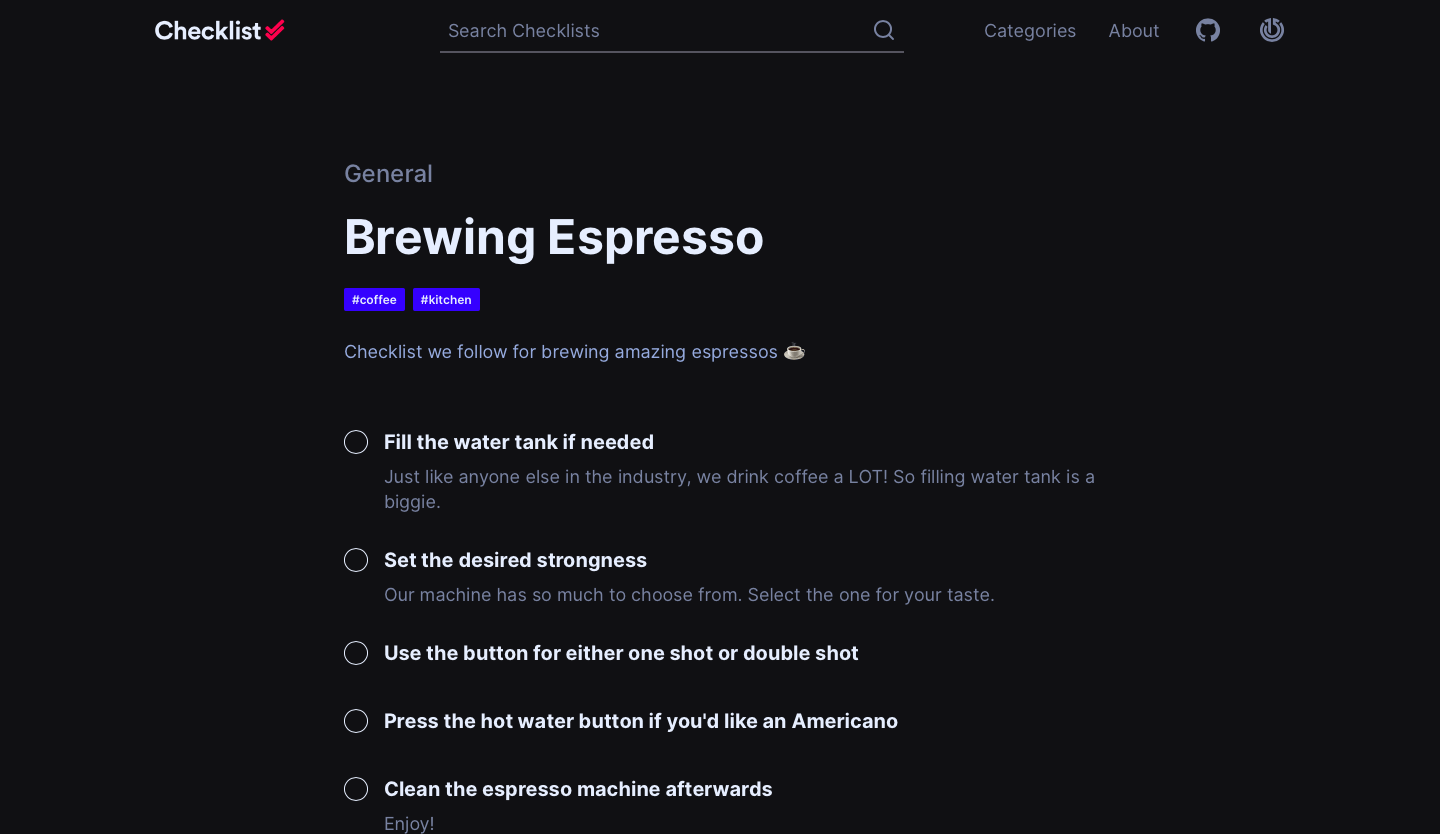 Bu kısa bilgilendirmenin ardından ürünü detaylı bir şekilde inceleyelim. Oldukça sade tasarlanan ana sayfada, arama çubuğu, belli konu başlıklarını içeren hashtagler ve kategoriler yer alıyor. Ana sayfa üzerinden şirketin GitHub sayfasını ve kurumsal sitesini hızlıca ziyaret edebilmeniz de mümkün. Aynı şekilde sayfada GitHub üzerinden Checklist önerebileceğiniz bir yönlendirme butonu da mevcut.