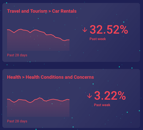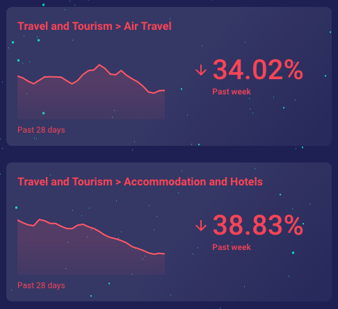 Sektörü alt başlıklar halinde uçak seyahati, oteller ve araç kiralama şeklinde ayıran SimilarWeb, otellere giden trafiği yakından izlemenin, salgının etkisinin büyüklüğü ve normalliğe dönüşün erken sinyali hakkında bir fikir verebileceğini belirtiyor. Verilere baktığımızda hava yolculuğunun yüzde 34,02, konaklama ve otellere olan talebin yüzde 38, 83 ve araç kiralamanın yüzde 32,52 oranında düştüğünü görüyoruz.