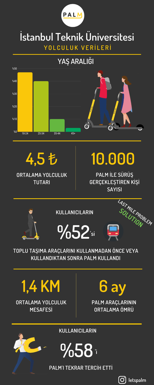 Paylaşılan bir diğer önemli bilgi ise Palm'ın başka şehirler ile anlaşması oldu. Önümüzdeki dönemde Palm'ın 3 yeni şehide daha hizmet vermeye başladığını göreceğiz. İstanbul Teknik Üniversitesi'ndeki yolculuk verilerini bir infografik ile paylaşan Palm'ın verilerine göre kullanıcılarının neredeyse yüzde 50'si 18-24 yaş aralığında.