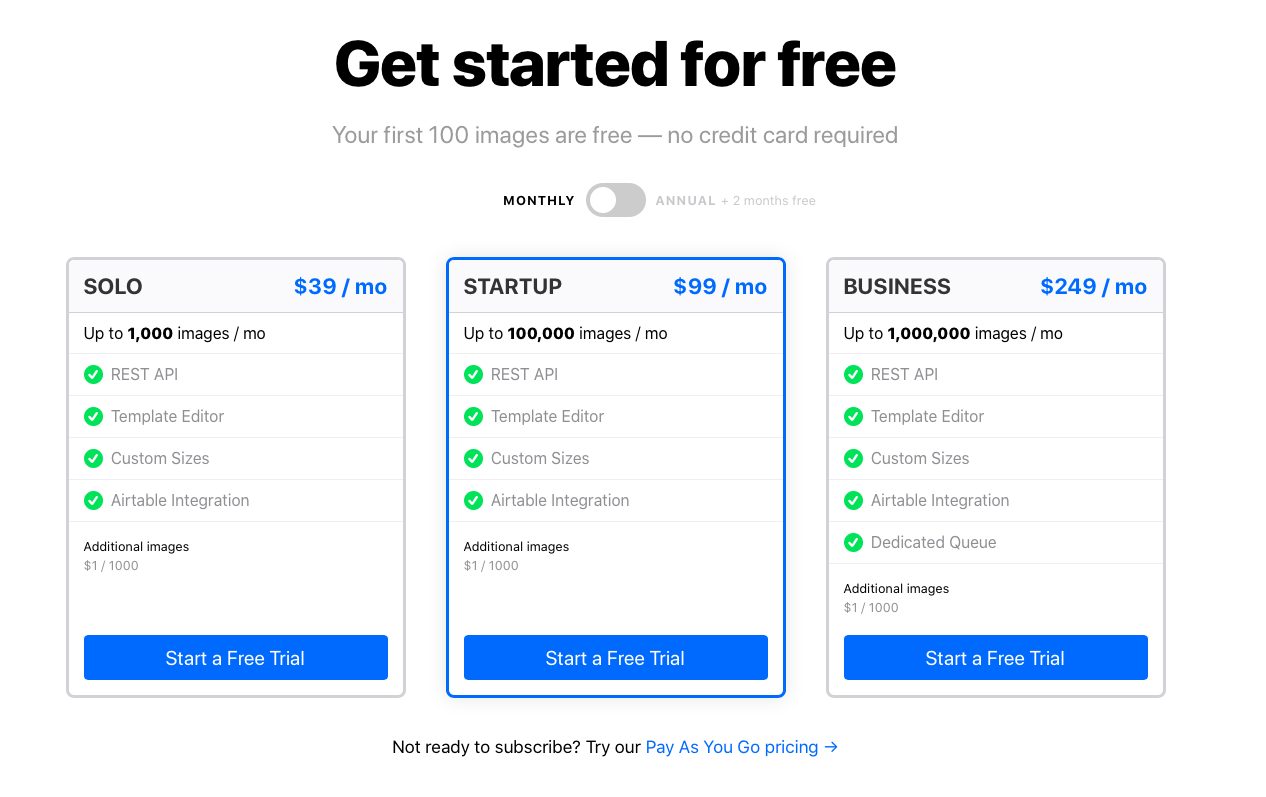 Bannerbear'da üreteceğiniz ilk 100 görsel ücretsiz sonrasında ise farklı Solo, Startup, Business olmak üzere farklı paket seçeneklerine geçiş yapabilirsiniz. Solo aylık 39 dolar, Startup aylık 99 dolar, Business ise aylık 249 dolara kullanıcıların ilgisine sunuluyor.