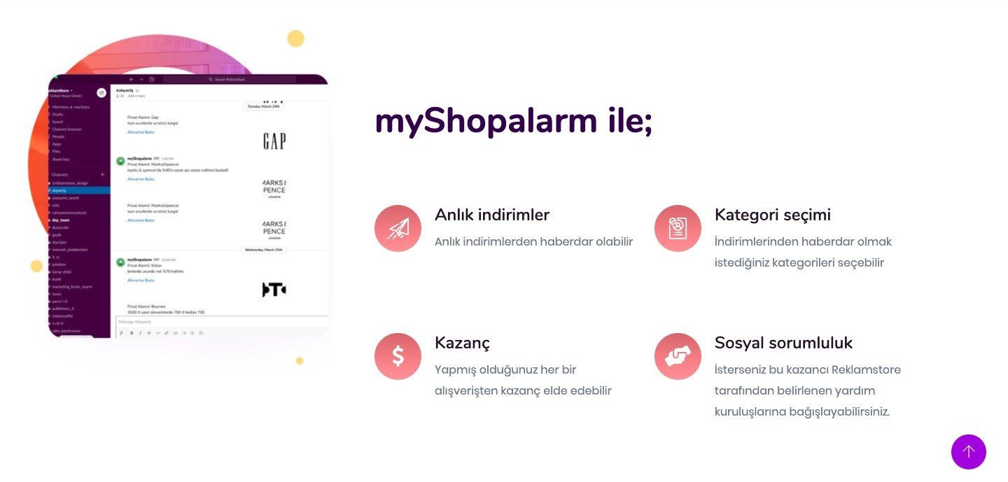 MyShopAlarm isimli Slackbot seçilen Slack kanalına e-ticaret şirketlerinin (ReklamStore affiliate networküne dahil olan) özel kampanya ve kupon kodlarını bildiriyor. Bu bildirimler üzerinden alışveriş gerçekleştiğinde ise şirketler veya Slack toplulukları gelir elde edebiliyorlar.
