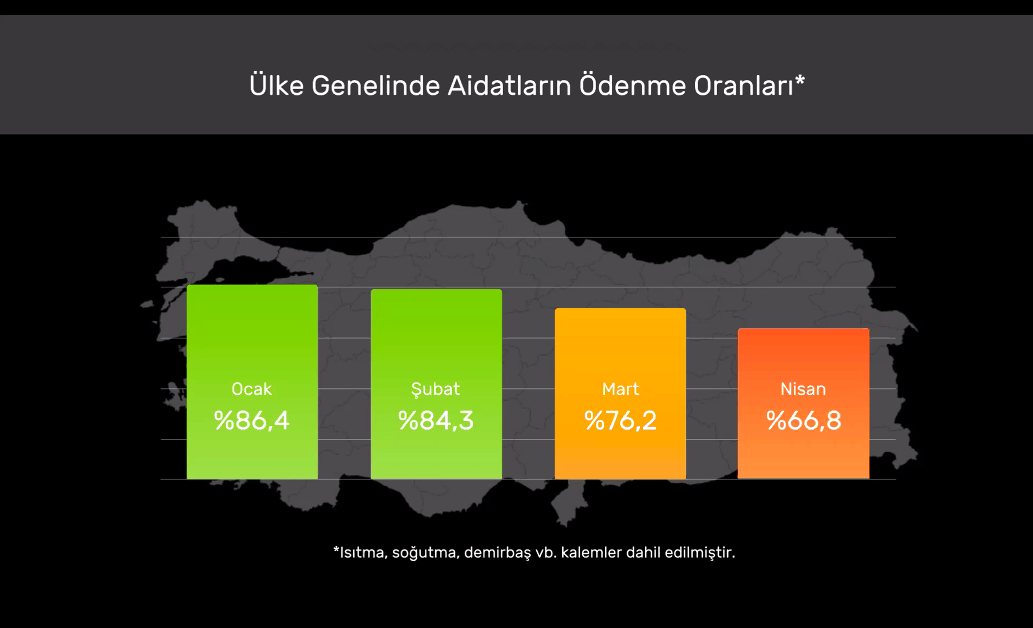 Ülke genelinde aidat ödeme oranlarının ocak ayından bugüne ciddi anlamda düşüşte olduğunu söyleyebiliriz. Ocak ayında yüzde 86,4 olan aidat ödeme oranı nisan ayına geldiğimizde yüzde 66,8'e geriliyor. Üstelik her ay bir öncekinden daha düşük olduğunu göze çarpıyor. Yaklaşık yüzde 20'lik bu düşüş, kişilerin gelir kaybı yaşadığı ve önceliklerinin değiştiği konusunda ipucu veriyor.