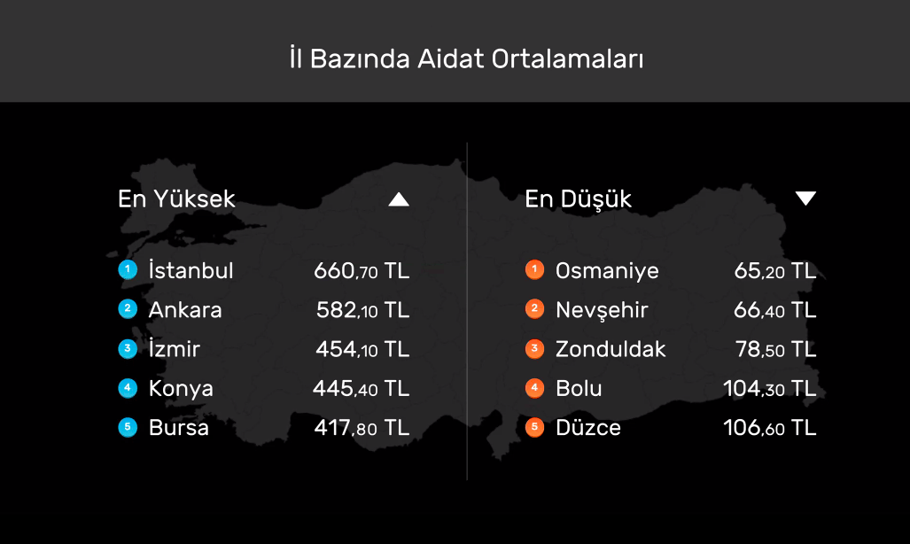 İl bazında aidat ücretlerine baktığımızda ise en yüksek ilin 660,70 TL ile İstanbul olduğunu görüyoruz. Onu Ankara, İzmir, Konya ve Bursa izliyor. En düşük aidat ücretine sahip il ise 65,20 TL ile Osmaniye oluyor. Nevşehir, Zonguldak, Bolu ve Düzce de aidat ücretlerinin düşük olduğu iller olarak karşımıza çıkıyor.