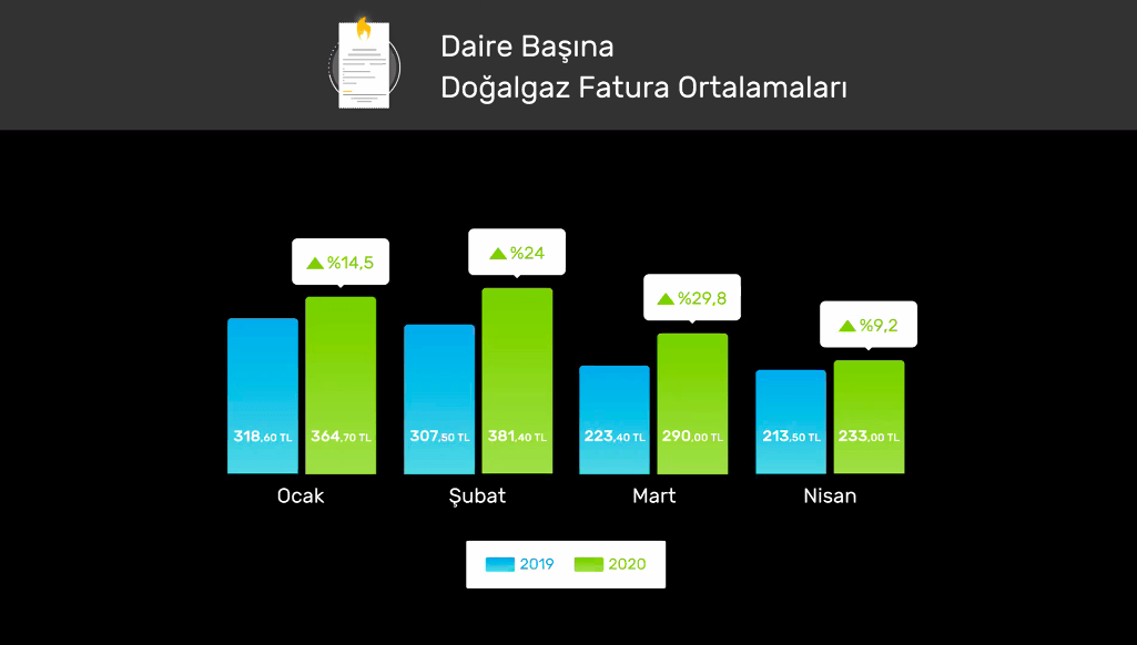 Daire başına doğalgaz faturası ortalamalarında da geçtiğimiz yılın aynı dönemine göre ciddi bir yükseliş var. Örneğin; Ocak 2019'da ortalama 318,60 TL olan fatura oranının bu sene ocak ayında 364,70 TL'ye ulaştığını görüyoruz. Aylık olarak havaların ısınmasıyla bir düşüş yaşansa da genel olarak geçtiğimiz seneden daha fazla doğalgaz faturası ödüyoruz.