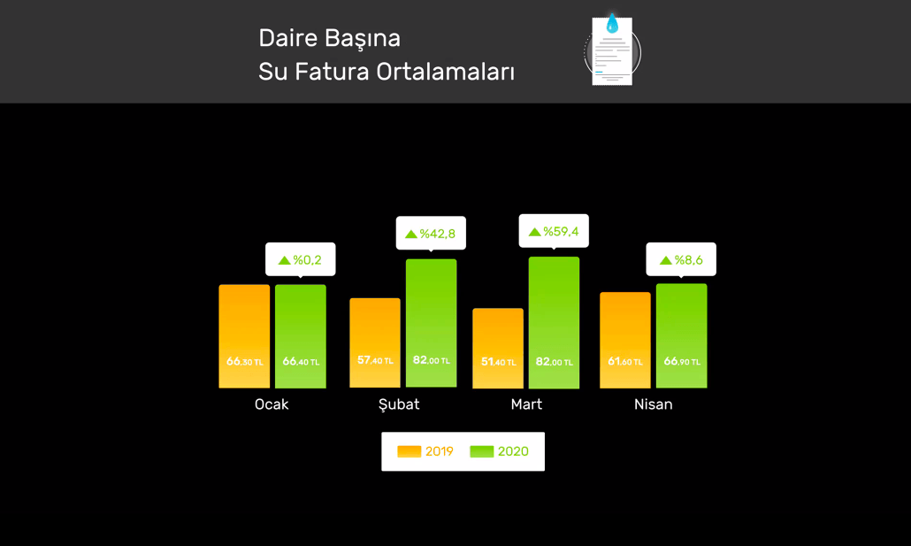 Su faturaları için de durum doğalgaz faturalarına benziyor. 2019 ve 2020 Ocak aylarında birbirinden çok farklı olmayan faturalar, zaman ilerledikçe bir sonraki sene yükselmeye başlıyor. Ancak burada ilginç çekici bir nokta var, zira nisan ayında faturaların bir hayli düştüğünü görüyoruz. Bu da kişilerin daha tedbirli olmaya başladığını gösteriyor.