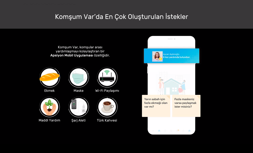 Apsiyon'un geçtiğimiz haftalarda yayına aldığı Komşum Var özelliği de bazı ilgi çekici sonuçların ortaya çıkmasına neden oluyor. Komşum Var'da en çok talep edilenler ekmek, maske, WiFi şifresi, şarj aleti, maddi yardım ve Türk kahvesi olurken, Apsiyon kurucu ortağı Kudret Türk'ün de söylediğine göre çamaşır makinesi hortumu, merdane, okey takımı ve tavla gibi ilginç istekler mevcut. Bu da kişilerin evde daha fazla vakit geçirmeye başladığının bir kanıtı aslında.