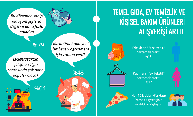 Anket sonçlarına göre; evde daha fazla zaman geçirmeye bağlı olarak temel gıda harcamalarının yüzde 68, atıştırmalık harcamalarının yüzde 20 oranında yükseldiğini belirtelim. Ev temizlik harcamaları yüzde 44 oranında artarken, hazır yemek harcamaları salgın öncesi döneme kıyasla yüzde 63 azaldı.