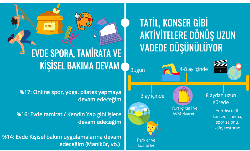 Her 10 katılımcıdan 6’sına göre (%64) salgın sonrası süreçte evden/uzaktan çalışma daha popüler olacak. Katılımcıların yüzde 17’si online yoga, pilates, spor alışkanlıklarına, yüzde 16’sı evde tamirat/DIY çalışmalarına ve yüzde 15’i evde kişisel bakım rutinlerine, yüzde 11’i ahşap, resim gibi sanatsal hobilerine, yüzde 7’si ise örgü, dantel gibi el işi hobilerine devam edecek.