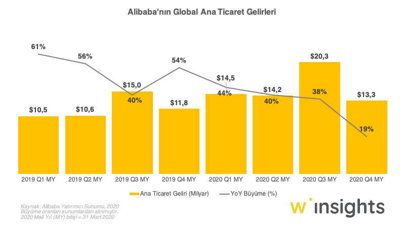 Alibaba, son dönemlerdeki en düşük büyüme oranını açıklayarak 2020 mali yılı için ana ticaret gelirlerini yaklaşık 13 milyar $ olarak duyurdu. Gelirlerdeki daralma elbette COVID-19 salgını ile birebir ilintili - mobilya ve giyimdeki düşüş nedeniyle bir önceki dönem %24 oranında büyüyen Tmall'un bu dönemki büyümesi %10 seviyelerinde kalmış görünüyor.