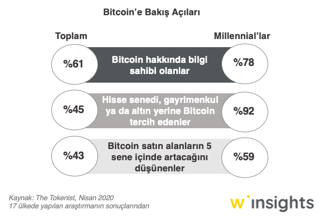 Yapılan araştırmalar da bitcoin ile ilgili bilgi sahibi olan, satın alan ve finansal servislerin birçoğuna alternatif olduğunu düşünenlerin arttığını gösteriyor. 2017 senesinde ilki yapılan bir araştırmanın 2020 sonuçlarına göre 65 yaş ve üzeri kitle haricinde bitcoin'e ilginin yükseldiği, özellikle 2008 krizinden daha çok etkilenen, borçlanma oranı daha yüksek olan, önceki kuşaklara göre birikim yapmak, mülk sahibi olmak gibi konularda zorlanan millennial kuşağının tercih ettiği yatırım yöntemlerinden biri olarak bitcoin öne çıkıyor.