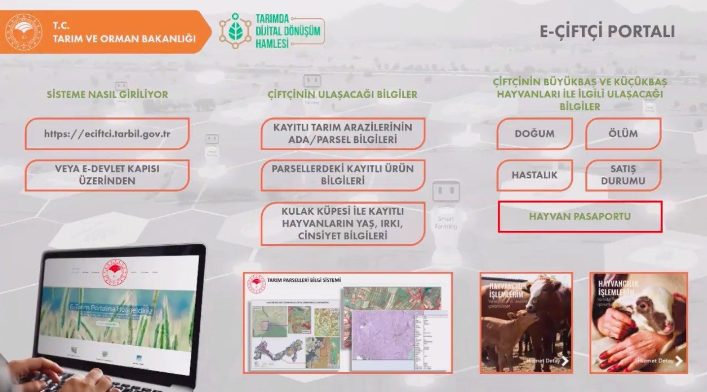 E-Tarım portalarının temel amacı ise çiftçilerin il/ilçe müdürlüklerine gitmeden işlem yapmalarını sağlayarak hem zamandan hem de paradan tasarruf etmelerine olanak tanımak. Son olarak bakanlığın devam eden dijital çalışmaları arasında hayvan takip platformu, üretim planlaması, elektrikli traktör ve tarım bilgi sistemlerinin modernizasyonu gibi çalışmalar da bulunuyor.
