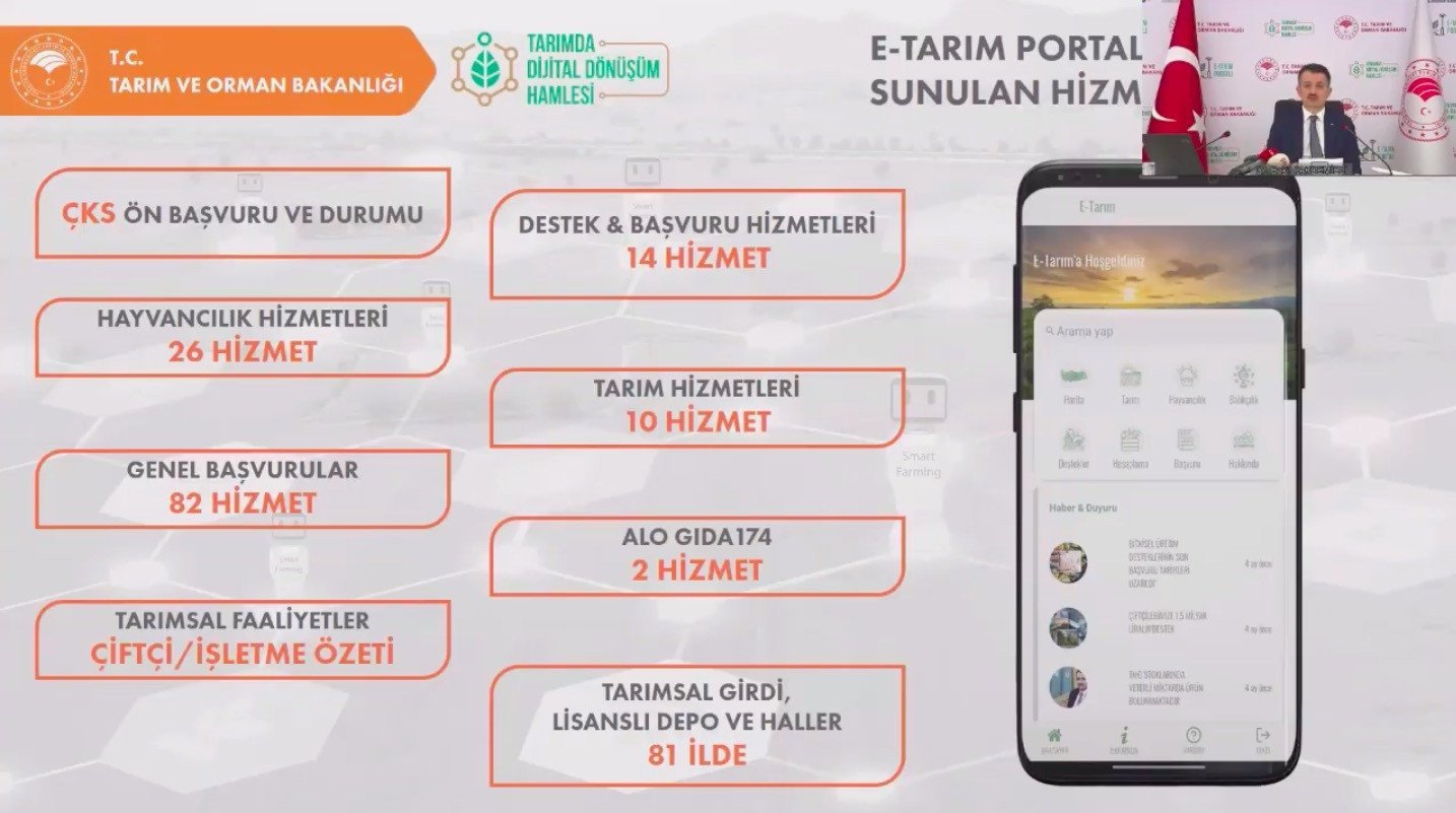 Tarım ve Orman Bakanlığı, bugün YouTube üzerinden düzenlediği online lansman ile tarımda dijital dönüşüm hamlesini ve E-Tarım platformunu tanıttı. Türkiye Cumhuriyeti Tarım ve Orman Bakanı Bekir Pakdemirli'nin de önemli açıklamalar yaptığı toplantıda, dijitalleşmenin önemli vurgulandı.