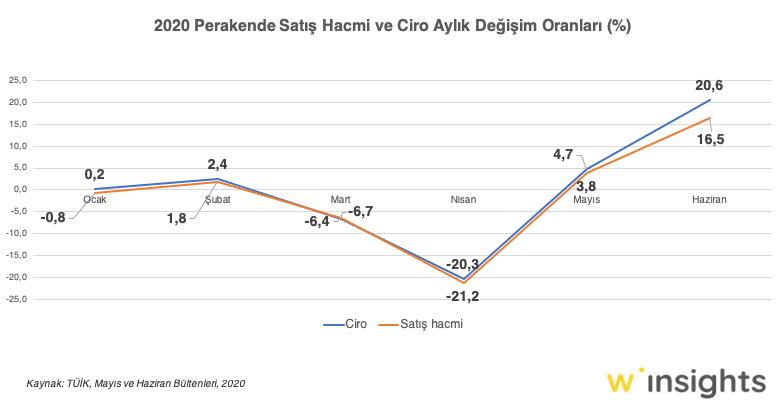 Nisan ve Mayıs aylarında düşen perakende satış hacim ve ciro endekslerinin Haziran ayında toparlanma sinyalleri verdiğini belirten TÜİK'e göre bir önceki aya göre %20'lere varan artış gözlemlenmiş. Temmuz ve Ağustos aylarında da turizmden de kaynaklanan hareketlenmelerin getirilerini ilerleyen aylarda görülebilir ancak aylık yükselişlere karşılık senelik endekslerde düşüş olduğunu ve beklentinin genel olarak daralma olarak yansıdığının da altını çizmek gerek.