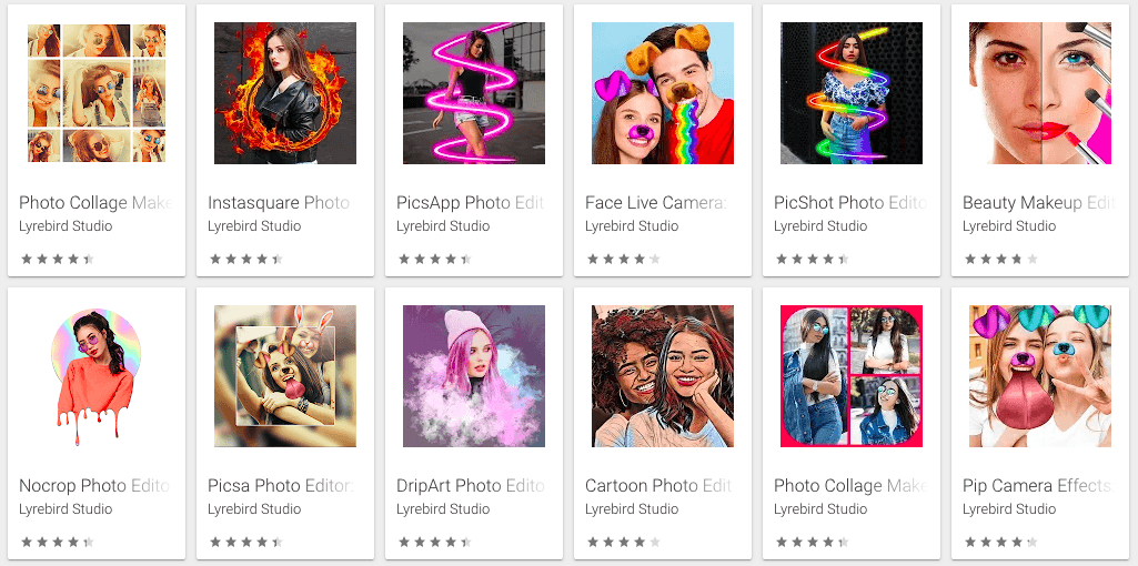 Lyrebird Studio'nun geliştirdiği uygulamalar arasında çoğunlukla fotoğraf düzenleme, video ve ses düzenleme uygulamaları ile canlı filtre uygulamaları, arka plan silme ve etiket üretme gibi medya araçları bulunuyor. Platformun en çok indirilen uygulamaları ise fotoğraf düzenleme uygulamaları olarak karşımıza çıkıyor.