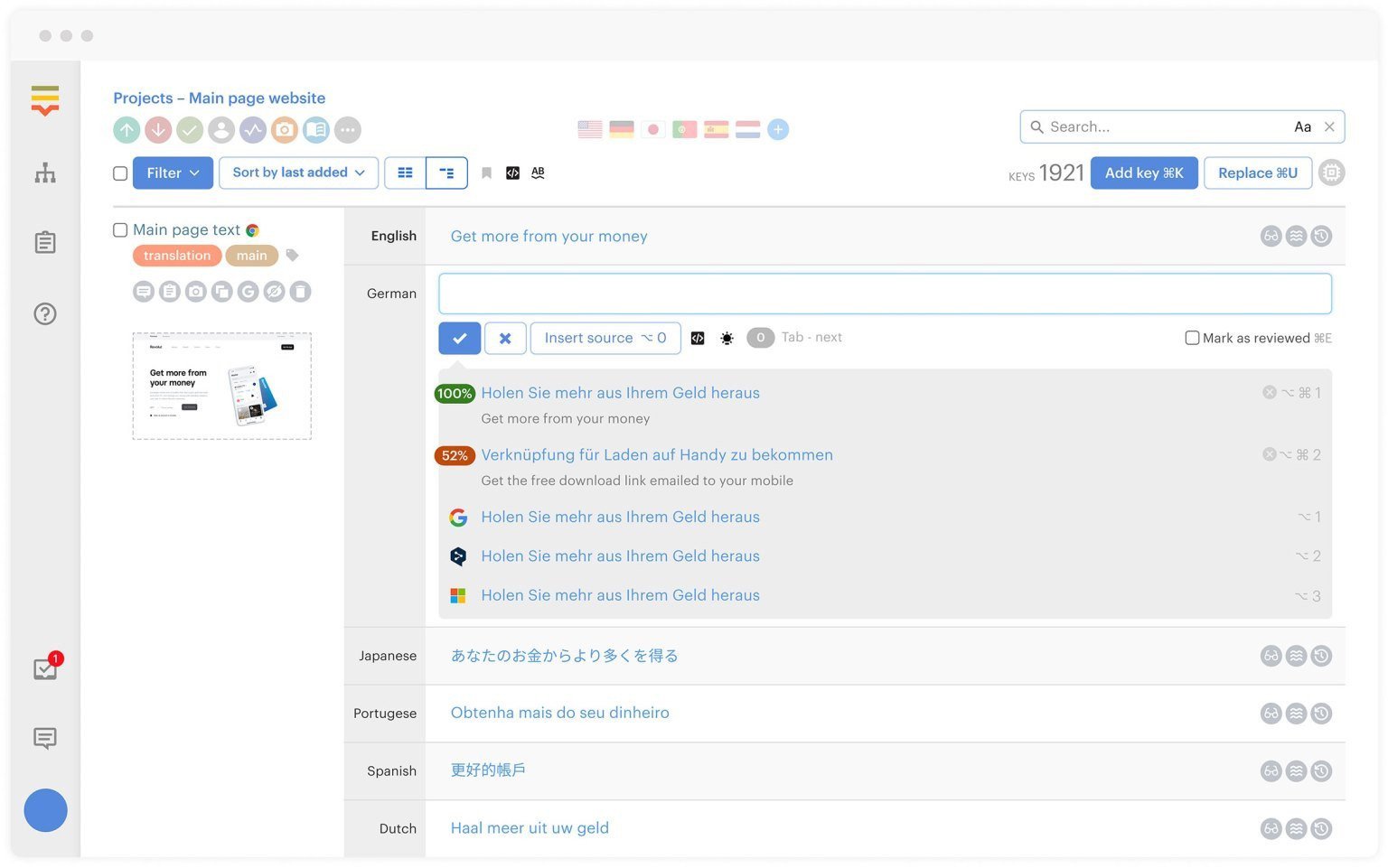Lokalise ile dil dosyalarınızı manuel olarak yükleyebiliyor; doğrudan GitHub veya GitLab ile entegre ederek değişiklikleri otomatik olarak gerçekleştirebiliyorsunuz. Daha sonra her cümleye farklı dillerde göz atabiliyorsunuz. Çevirmen ekibiniz Lokalise arayüzündeki metni düzenleyebiliyor ve web tabanlı bir hizmet olarak herkes aynı sayfada işlem yapabiliyor. Bazı üretkenlik özellikleri, diğer ekip üyeleriyle iş birliği yapmanıza olanak tanıyor. Başkalarına yorum yapabiliyor ve onlardan bahsedebiliyorsunuz. Her şey tamamlandığında Lokalise'i, SDK'lar ve API kullanarak dil dosyalarını dinamik olarak mobil uygulamalarınıza göndermek için kullanmanız da mümkün oluyor.