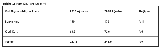 Bankalararası Kart Merkezi (BKM), 2020 yılının ağustos ayına ilişkin verilerini açıkladı. BKM'nin verilerine göre, ağustos ayı sonunda Türkiye'de 72,6 milyon adet kredi kartı, 176 milyon adet banka kartı kullanılıyor. 2019 yılının ağustos ayı ile kıyaslandığında kredi kartı sayısında yüzde 6'lık, banka kartı sayısında ise yüzde 11'lik artış görülüyor. Toplam kart sayısı ise 248,6 milyon adede ulaşarak geçen yılın aynı dönemine göre yüzde 9 oranında artış gösterdi.