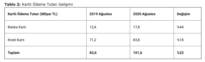 Banka kartları ve kredi kartları ile ağustos ayında toplam 101,6 milyar TL'lik ödeme yapıldı. Bu tutarın 83,8 milyar TL'si kredi kartlarıyla ödenirken, 17,8 milyar TL'sinde banka kartları kullanıldı. Büyüme oranları özelinde incelendiğinde banka kartıyla yapılan ödemelerde bir önceki yılın aynı dönemine göre büyüme oranı yüzde 44 olurken, kredi kartıyla yapılan ödemelerde ise bu oran yüzde 18 olarak gerçekleşti. Toplam kartlı ödemeler büyümesi ise yüzde 22 oldu.