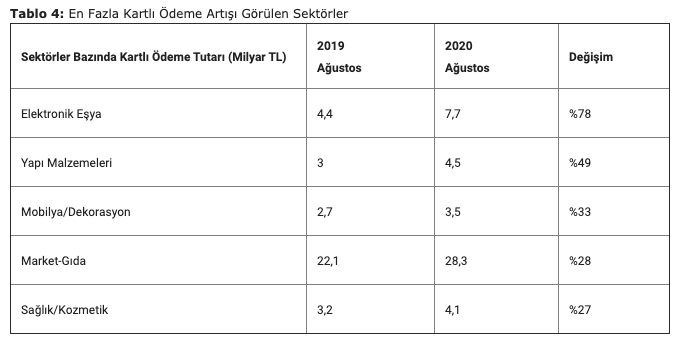 Kartlı ödemelerde, 2020 yılının ağustos ayında geçen yılın aynı dönemine göre en fazla artışın hangi sektörlerde gerçekleştiği detaylı incelendiğinde, “elektronik eşya”nın yüzde 78 ile en fazla artış gerçekleşen sektör olduğu görüldü. “Yapı malzemeleri” yüzde 49, “mobilya/dekorasyon” yüzde 33, “market-gıda” yüzde 28 ve “sağlık/kozmetik” sektörü yüzde 27 büyüme ile kartlı ödemelerde en fazla artış görülen diğer sektörler arasında yer aldı.