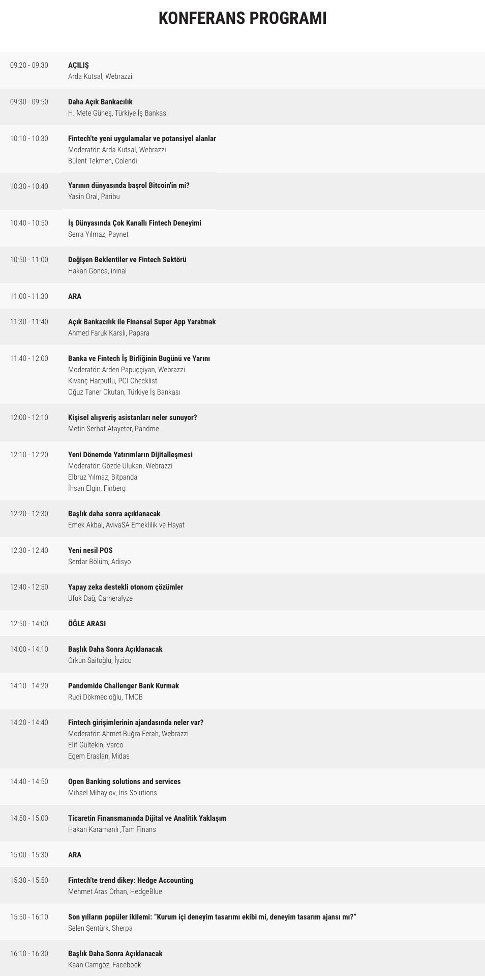 Günümüzün finansal teknolojileri, bankacılığın dönüşümü, blockchain ve öne çıkan tüm başlıklarını girişimciler ve sektörün lider finansal kuruluşları ile masaya yatıracağız. Dilerseniz Webrazzi Fintech 2020'nin konuşmacılarını detaylı olarak buradan inceleyebilir ve konferansımıza katılım sağlamak isterseniz buradan bilet alabilirsiniz.