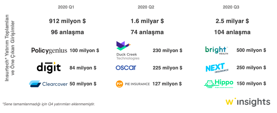 Sene başındaki durgunluğun 3. çeyrekte toparlanmaya başladığı insurtech'lerde yatırımların daha olgunlaşmış girişimlerle dijital platformlarını güçlü kullanan şirketlerde yoğunlaştığını görüyoruz.