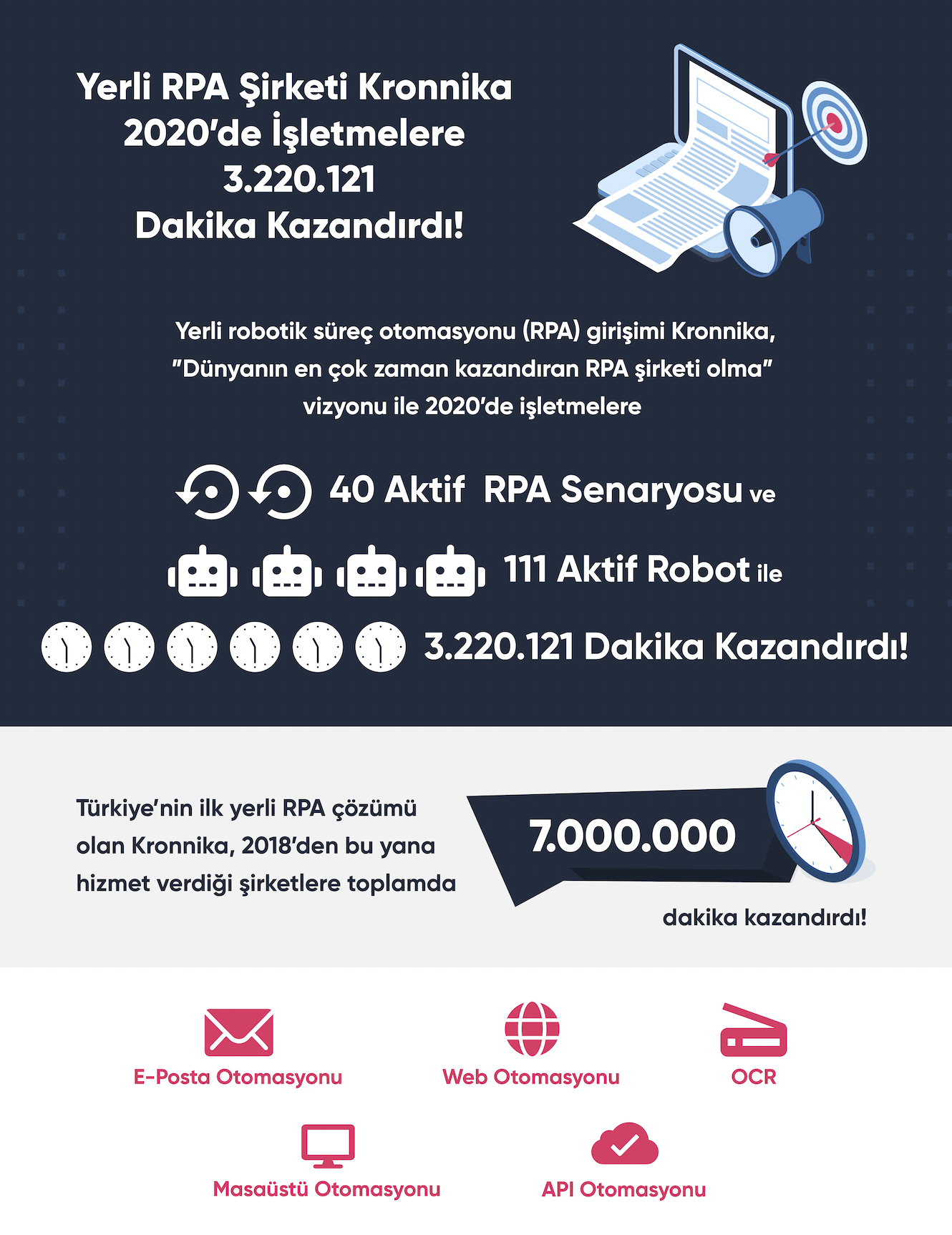 Paylaşılan bilgilere göre Kronnika, 2020 yılında şirketlere yaklaşık 3 milyon 220 bin 121 dakika kazandırarak, şirketlerin verimliliğini artırdı. 2020 yılında 111 aktif robot sayısına ulaşan girişim, 40 aktif RPA senaryosu ile şirketlerin dijital dönüşüm süreçlerini hızlandırmaya devam ediyor.