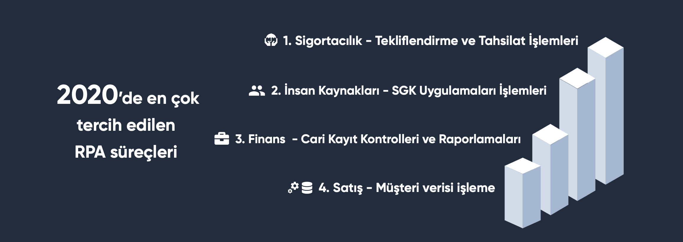 Kronnika’da bu yıl en çok tercih edilen RPA süreçlerinin başında Sigortacılık sektöründeki Tekliflendirme ve Tahsilat süreçleri geliyor. İkinci sırada SGK Uygulamaları İşlemleri ile İnsan Kaynakları yer alırken, finans alanında Cari Kayıt Kontrolleri ve Raporlamaları’nın 3. sırada yer alıyor.