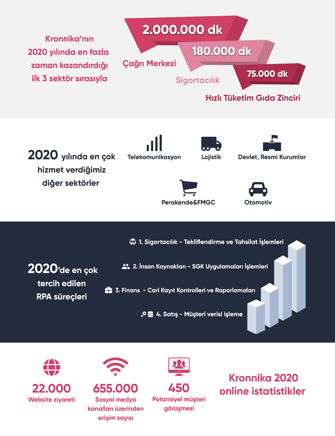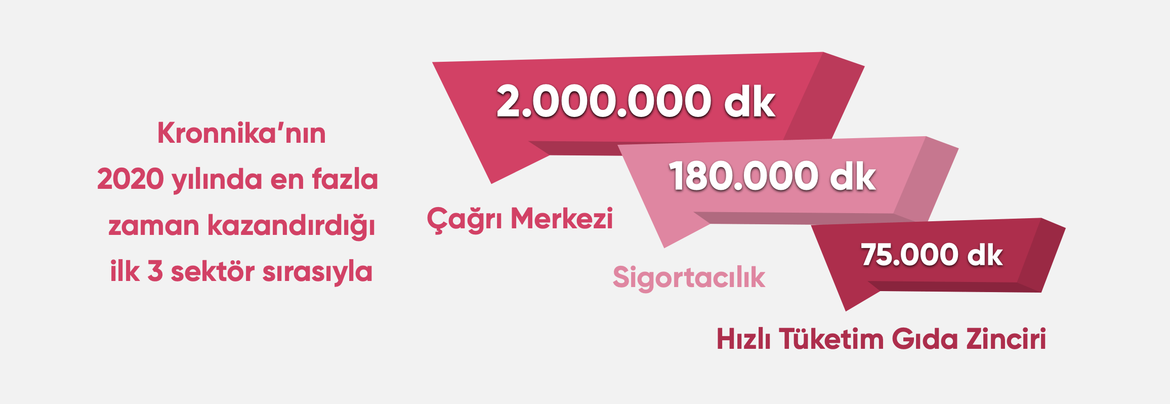 Kronnika’nın 2020 yılında en fazla zaman kazandırdığı ilk 3 sektör ise sırasıyla çağrı merkezi, sigortacılık ve hızlı tüketim gıda sektörü oldu. Kronnika 2020’de çağrı merkezi sektörüne yaklaşık 2 milyon dakika kazandırırken, sigortacılık sektörünün 180 bin dakika kazanmasını sağladı. Hızlı tüketim gıda zincirleri ise Kronnika ile 2020 yılında toplamda 75 bin dakika tasarruf sağladı.