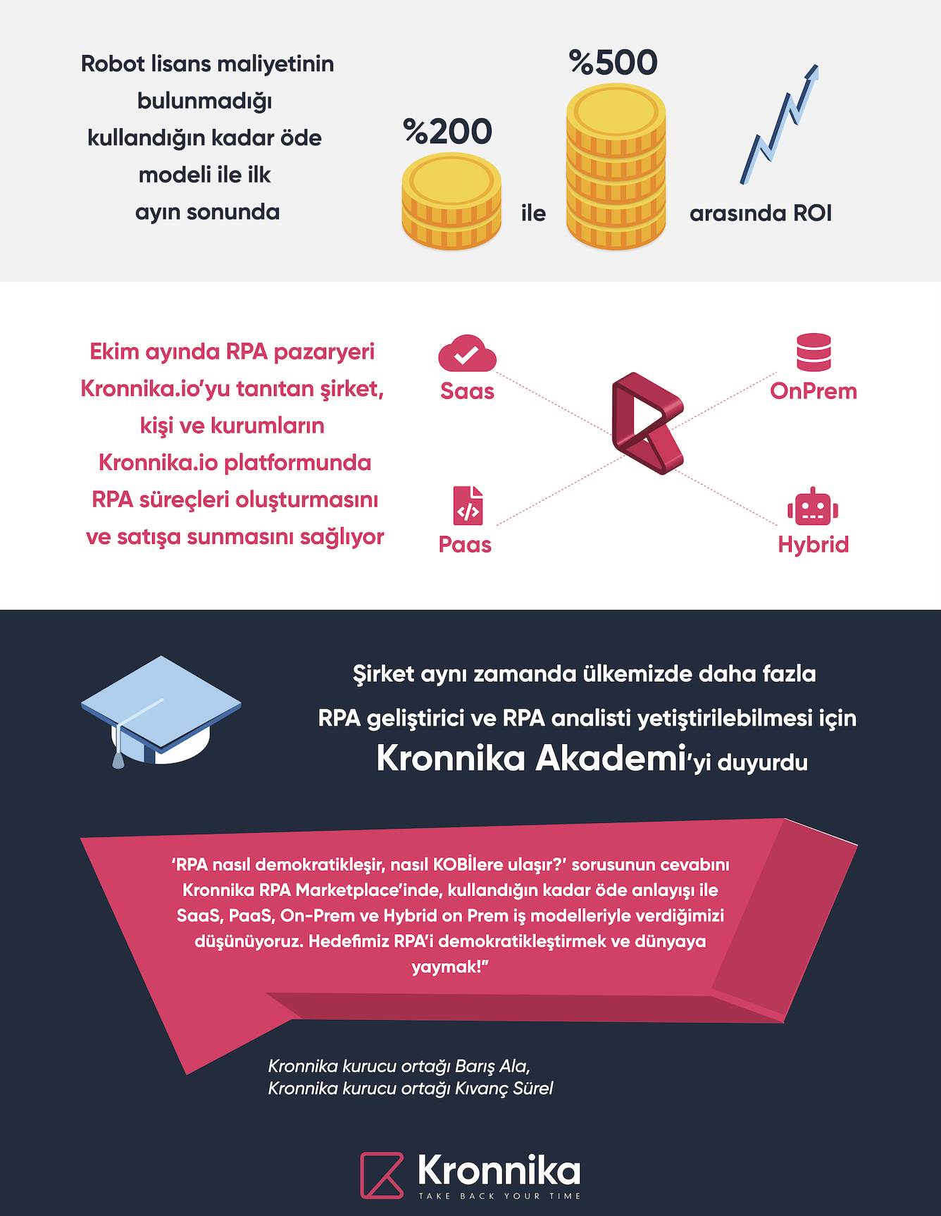 Ekim ayında RPA Pazar yeri Kronnika.io’yu tanıtan şirket, kişi ve kurumların Kronnika.io platformunda RPA süreçleri oluşturmasını ve satışa sunmasını da sağlıyor. Şu an için sınırlı sayıda kullanıcıya açılmış olan Kronnika.io çok kısa süre sonra tüm kullanıcıların erişimine açık olacak. Platform, SaaS, PaaS, On-Prem ve Hybrid on Prem iş modelleriyle RPA’i demokratikleştirmeyi hedefliyor.