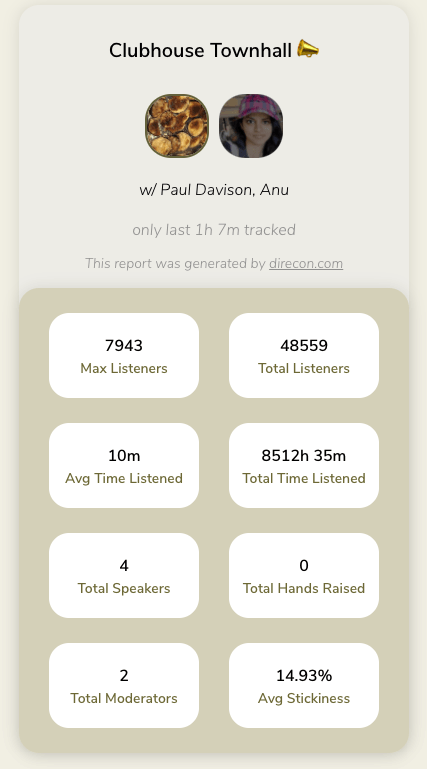 Altyapısında Agora ve Pubnub servislerini kullanmayı seçen Clubhouse'daki gizlilik sorunları elbet bir noktada çözülür. Ancak uygulamanın kullanıcı tarafında, bana kalırsa bazı sıkıntılar var. Bunlardan biri de yönettiğiniz odalara dair istatistiklere ulaşamıyor olmanız. Clubhouse'un basit bir "sohbet" uygulamasından öteye geçebilmesi ve farklı alanlarda da kullanılabilmesi için kullanıcıların bazı istatistiklere ulaşabilmesi gerektiğini düşünüyorum. Fakat şirket bir odaya toplamda kaç kullanıcının katıldığı, kişilerin ortalama kaç dakika konuştuğu gibi bilgileri paylaşmıyor. Bu açığı gören geliştiriciler de Clubhouse oturumlarını yönetmeyi kolaylaştıran ve oturumlarla ilgili istatistikler sunan Direcon adlı bir araç geliştirdi.