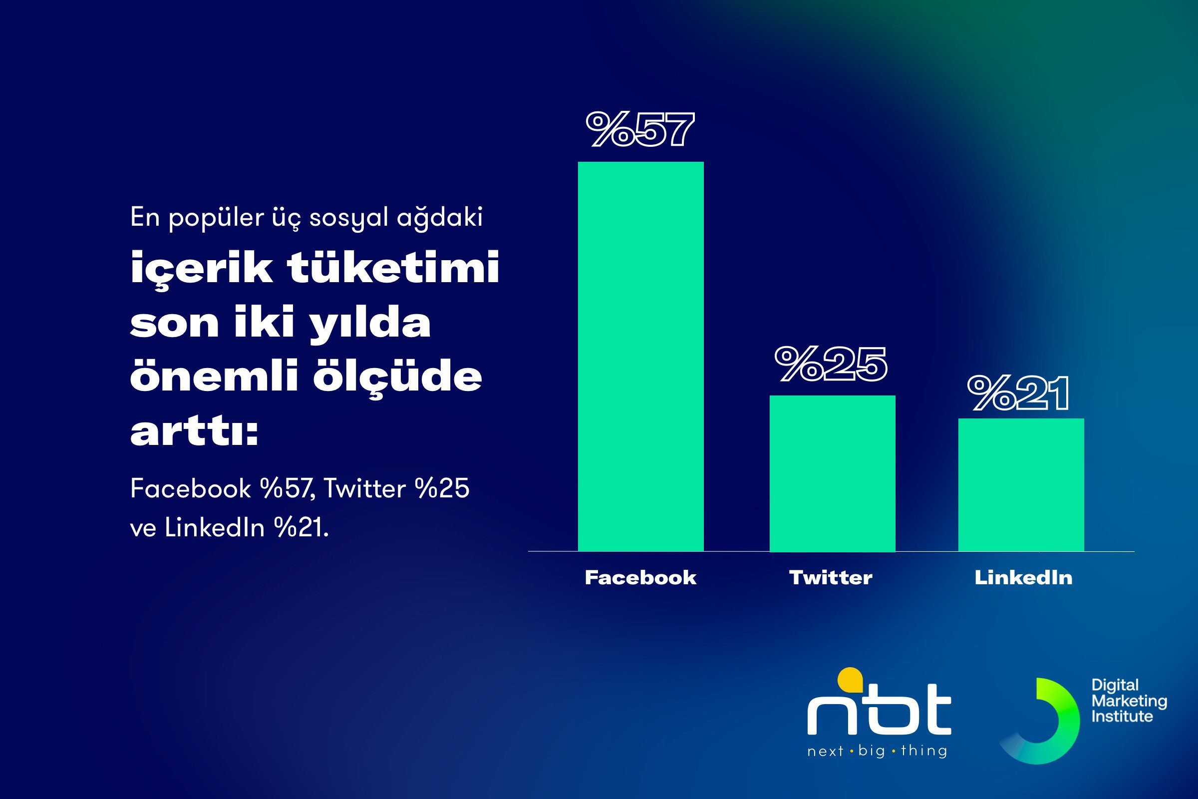 Rapordaki veriler, Facebook kullanıcılarının dakika başı yaklaşık 2,5 milyon içerik paylaştığını gösteriyor. Bnun yanı sıra En popüler üç sosyal ağ Facebook, Twitter ve LinkedIn'de içerik tüketimi önemli seviyede artış gösterdi. Facebook'taki içerik tüketimi yüzde 57 artış gösterirken, bu metrik Twitter'da yüzde 25, LinkedIn'de ise yüzde 21 olarak kendini gösteriyor.