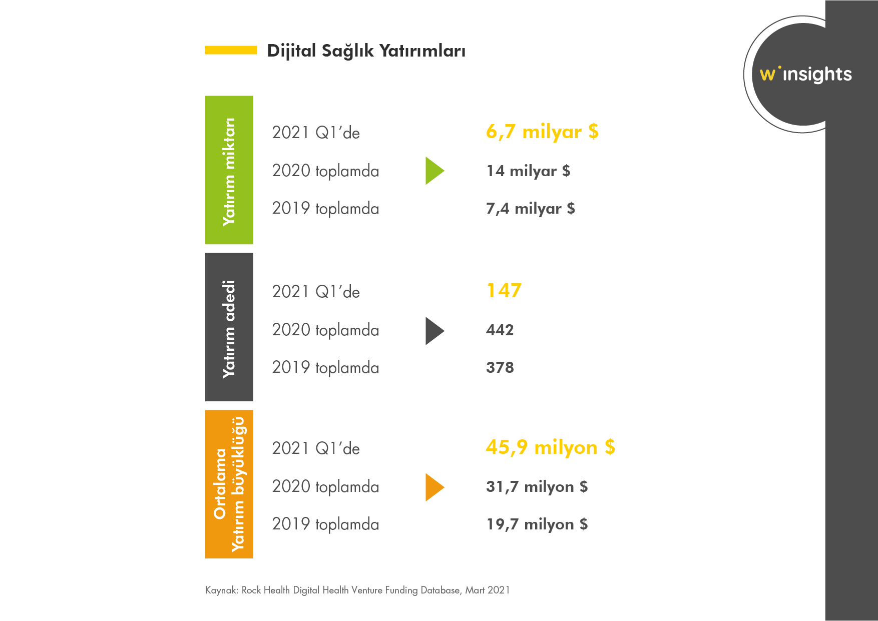 Sağlık alanındaki girişimler senenin ilk çeyreği ile 2020'nin öne çıkan yatırımlarını takip eder şekilde büyümeye devam etti. Hasta merkezli girişimler, veri analitiği ve takip sistemlerinin ağırlıkta olduğu girişimler, telesağlık, zihinsel sağlık, medikal cihazlar ve kadınlara özel sağlık uygulamaları gibi trendlerle şekillenmekte. IPO ve SPAC'ların da görülmeye başladığı sektörde girişimler de kendi içlerinde çeşitlenerek faaliyet alanlarını genişletmekte ve farklı gruplar için özel uygulamalar geliştirmeyi sürdürüyor.