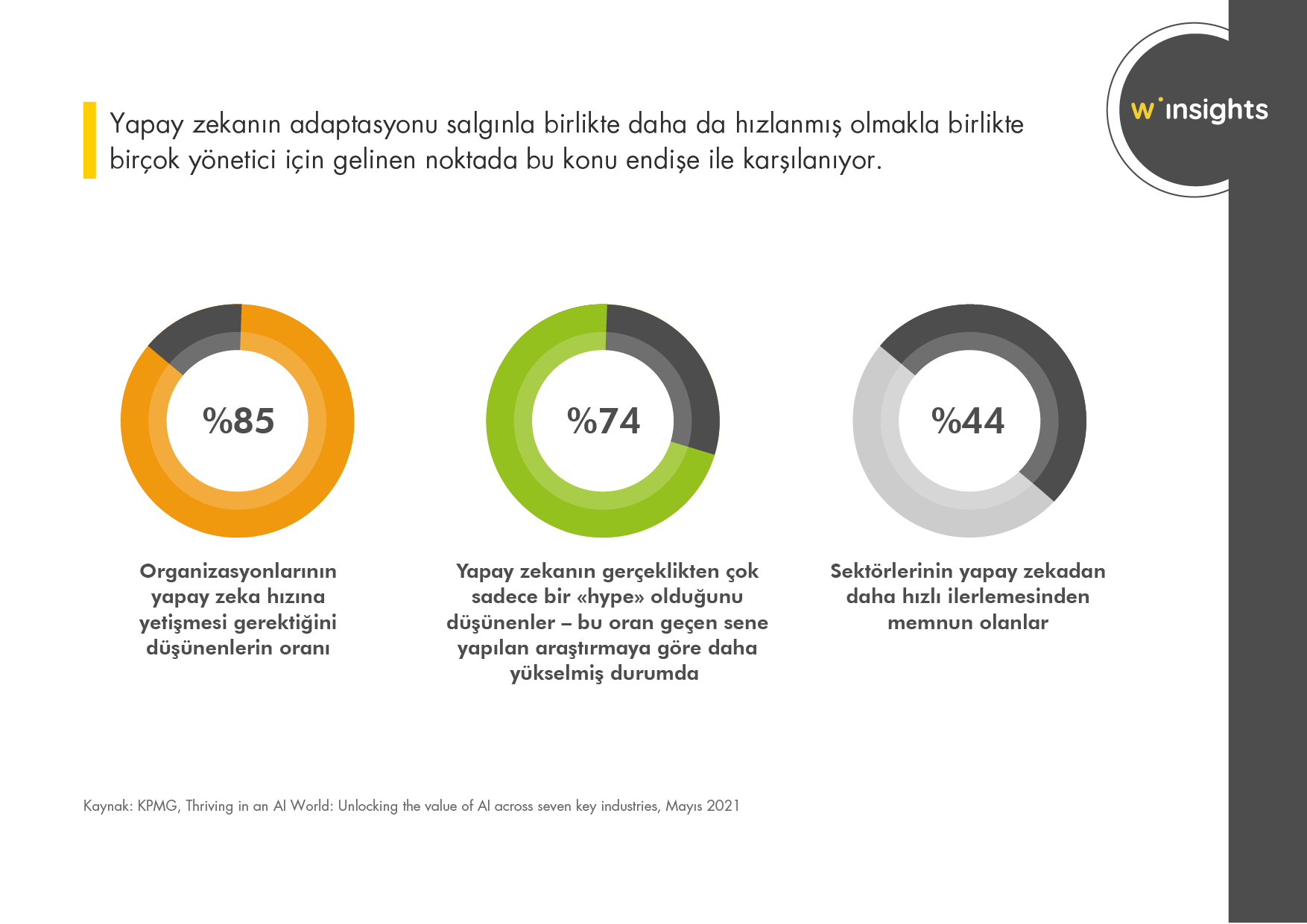 Dijital dönüşüm ile hızlanan yapay zeka projeleri, belki de son dönem gelişmeler olmasaydı önümüzdeki 2 - 3 sene içinde canlıya alınacaktı. Perakende, finansal servisler ve sağlık gibi sektörler başta olmak üzere farklı yerlerde ele alınan yeniliklerin gelişmesinin önemli rol oynadığı yapay zeka teknolojileri her ne kadar birçok süreci kolaylaştırmış olsa da yöneticiler tarafından tüm bu değişikliklerin fazla hızlı olduğunu da düşündürtmekte.